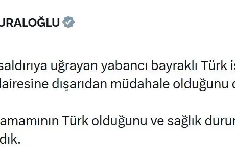 ANKARA, (DHA)- ULAŞTIRMA ve Altyapı Bakanı Abdulkadir Uraloğlu, Karadeniz'de saldırıya uğrayan yabancı bayraklı ve Türk işletenli gemiye ilişkin, "27 mürettebatın tamamının Türk olduğunu ve sağlık durumlarının da iyi olduğu bilgisini aldık" dedi.