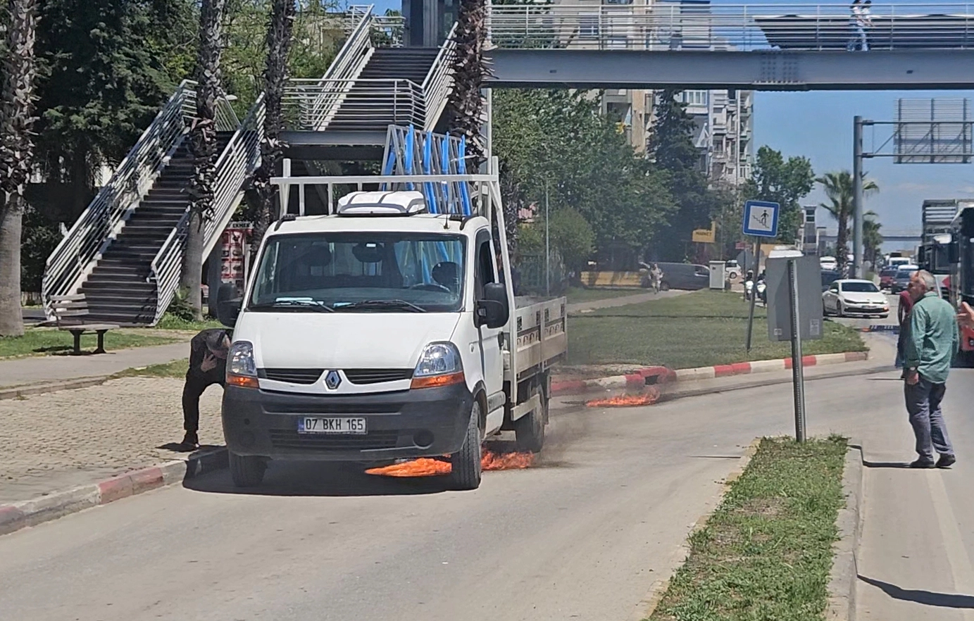 Kepez ilçesi Gazi Bulvarı’nda öğle saatlerinde seyir halinde olan 07 BKH 165 plakalı kamyonette, benzin kaçağı nedeniyle yangın çıktı. Dökülen benzin asfalt üzerinde de alev aldı. Kamyonetin sürücüsü, yol kenarında aracı durdurup inerek, diğer sürücülerden yardım istedi. Yoldan geçen sürücüler, araçlarındaki yangın tüpleriyle müdahale ederek, kamyonetteki yangını söndürdü. Kamyonetin sürücüsü, yangın tüpleriyle yardıma koşanlara, "Allah hepinizden razı olsun" diyerek teşekkür etti. Yangın nedeniyle kısa süreli aksayan trafik, normale döndü. Çevredekilerin ihbarıyla olay yerine gelen itfaiye ekibi, yangının çıkış nedenini belirlemek için çalışma yürüttü. (DHA)