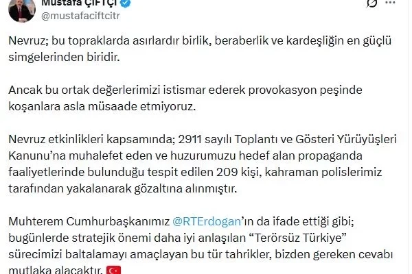 İçişleri Bakanı Mustafa Çiftçi de sanal medya hesabından yaptığı açıklamada, "Nevruz; bu topraklarda asırlardır birlik, beraberlik ve kardeşliğin en güçlü simgelerinden biridir. Ancak bu ortak değerlerimizi istismar ederek provokasyon peşinde koşanlara asla müsaade etmiyoruz. Nevruz etkinlikleri kapsamında, 2911 sayılı Toplantı ve Gösteri Yürüyüşleri Kanunu’na muhalefet eden ve huzurumuzu hedef alan propaganda faaliyetlerinde bulunduğu tespit edilen 209 kişi, kahraman polislerimiz tarafından yakalanarak gözaltına alınmıştır. Muhterem Cumhurbaşkanımız Recep Tayyip Erdoğan'ın da ifade ettiği gibi, bugünlerde stratejik önemi daha iyi anlaşılan 'Terörsüz Türkiye' sürecimizi baltalamayı amaçlayan bu tür tahrikler, bizden gereken cevabı mutlaka alacaktır" ifadelerini kullandı. (DHA)