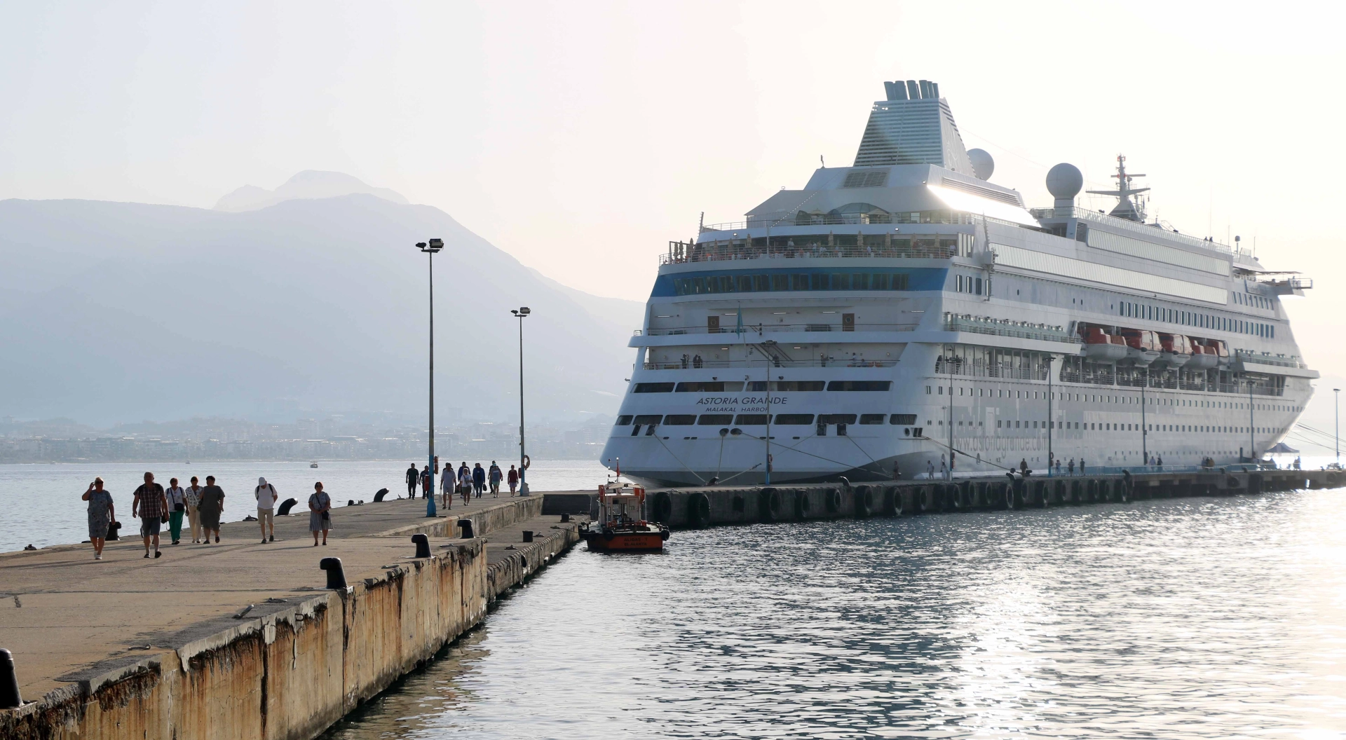 Palau bayraklı 193 metre uzunluğundaki 'Astoria Grande' adlı kruvaziyer, Antalya'dan yola çıktı. Çoğunluğu Rus vatandaşı olmak üzere toplamda 867 turist ve 439 personelin bulunduğu gemi bu sabah Alanya Limanı'na demirledi. Gümrük işlemleri tamamlandıktan sonra turistler gemiden inerek ilçe merkezine dağıldı. Kruvaziyerin saat 19.00'de İzmir'e gitmek üzere demir alacağı öğrenildi. (DHA)