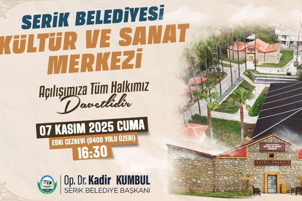 Serik Belediye Başkanı Op. Dr. Kadir Kumbul, tüm vatandaşları, Serik Belediyesi Kültür ve Sanat Merkezi açılışına davet etti. Başkan Kumbul; “Tarihimize, kültürümüze ve sanatımıza sahip çıktığımız bu anlamlı günde siz değerli hemşehrilerimizi aramızda görmekten büyük mutluluk duyarız” dedi.