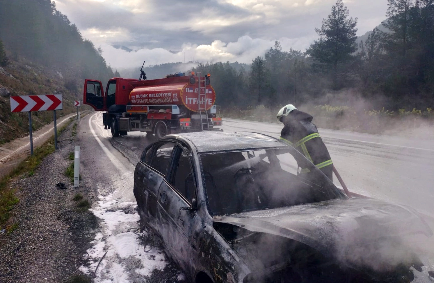 Antalya- Isparta kara yolunda seyir halindeki 07 ACU 706 plakalı otomobilin motor aksamından duman yükseldiğini fark eden sürücü, aracını yol kenarında durdurdu. Kısa sürede büyüyen alevler tüm aracı sararken, ihbar üzerine olay yerine itfaiye ve jandarma ekipleri sevk edildi. İtfaiye ekiplerinin hızlı müdahalesiyle yangın kontrol altına alınarak söndürüldü. Çıkış sebebi henüz belirlenemeyen yangın sonrası araçta büyük çapta maddi hasar meydana geldi. (DHA)
