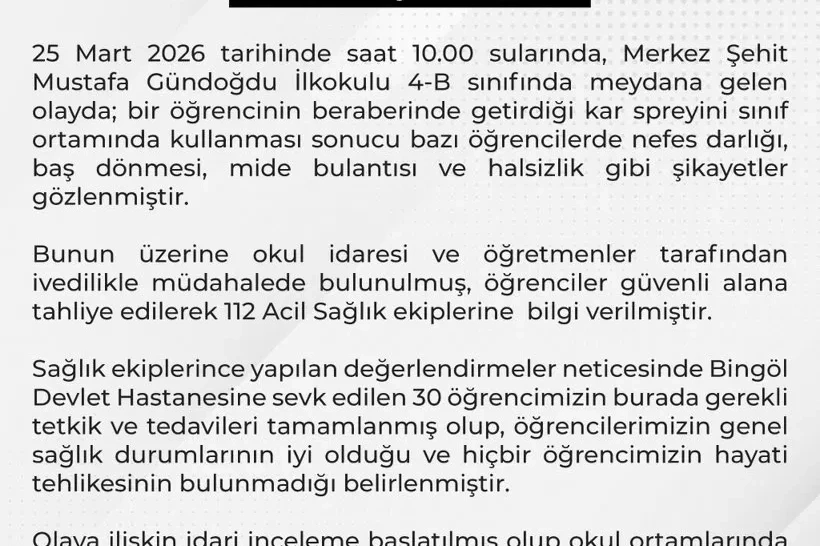Bingöl’de bir öğrencinin sınıfa getirdiği kar spreyini kullanması sonucu açığa çıkan gazdan etkilenen öğrenci sayısı 30’a yükseldi. Bingöl Valiliği’nden yapılan açıklamada, öğrencilerin sağlık durumlarının iyi olduğu belirtilerek, “25 Mart 2026 tarihinde saat 10.00 sularında, Merkez Şehit Mustafa Gündoğdu İlkokulu 4-B sınıfında meydana gelen olayda; bir öğrencinin beraberinde getirdiği kar spreyini sınıf ortamında kullanması sonucu bazı öğrencilerde nefes darlığı, baş dönmesi, mide bulantısı ve halsizlik gibi şikayetler gözlenmiştir. Bunun üzerine okul idaresi ve öğretmenler tarafından ivedilikle müdahalede bulunulmuş, öğrenciler güvenli alana tahliye edilerek 112 Acil Sağlık ekiplerine bilgi verilmiştir. Sağlık ekiplerince yapılan değerlendirmeler neticesinde Bingöl Devlet Hastanesine sevk edilen 30 öğrencimizin burada gerekli tetkik ve tedavileri tamamlanmış olup, öğrencilerimizin genel sağlık durumlarının iyi olduğu ve hiçbir öğrencimizin hayati tehlikesinin bulunmadığı belirlenmiştir. Olaya ilişkin idari inceleme başlatılmış olup okul ortamlarında bu tür ürünlerin bulundurulmasına yönelik denetim ve bilgilendirme faaliyetleri arttırılacaktır. Kamuoyuna saygıyla duyurulur” denildi. (DHA)