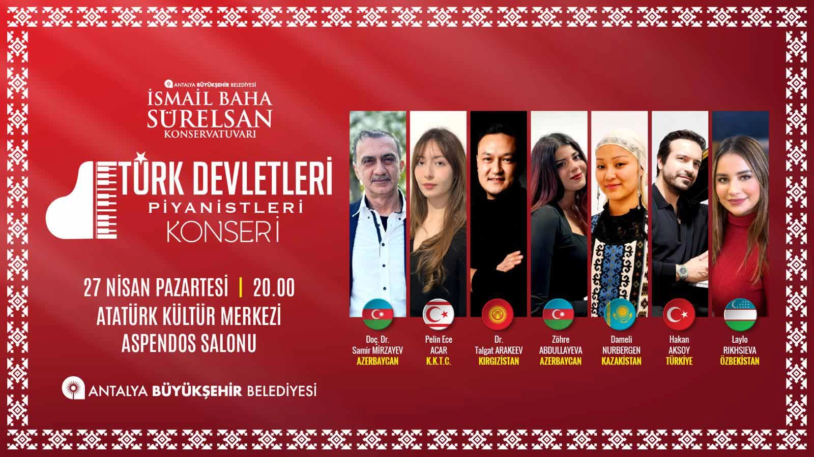 Antalya Büyükşehir Belediyesi İsmail Baha Sürelsan Konservatuvarı'nın hazırladığı Türk Devletleri Piyanistleri Konseri, 27 Nisan Pazartesi saat 20.00'de Atatürk Kültür Merkezi Aspendos Salonu'nda ücretsiz olarak gerçekleşecek. Konserde Azerbaycan’dan Doç. Dr. Samir Mirzayev ve Zöhre Abdullayeva, Kuzey Kıbrıs Türk Cumhuriyeti’nden Pelin Ece Acar, Kırgızistan’dan Dr. Talgat Arakeev, Kazakistan’dan Dameli Nurbergen, Türkiye’den Hakan Aksoy ve Özbekistan’dan Laylo Rıkhsıeva yer alacak.