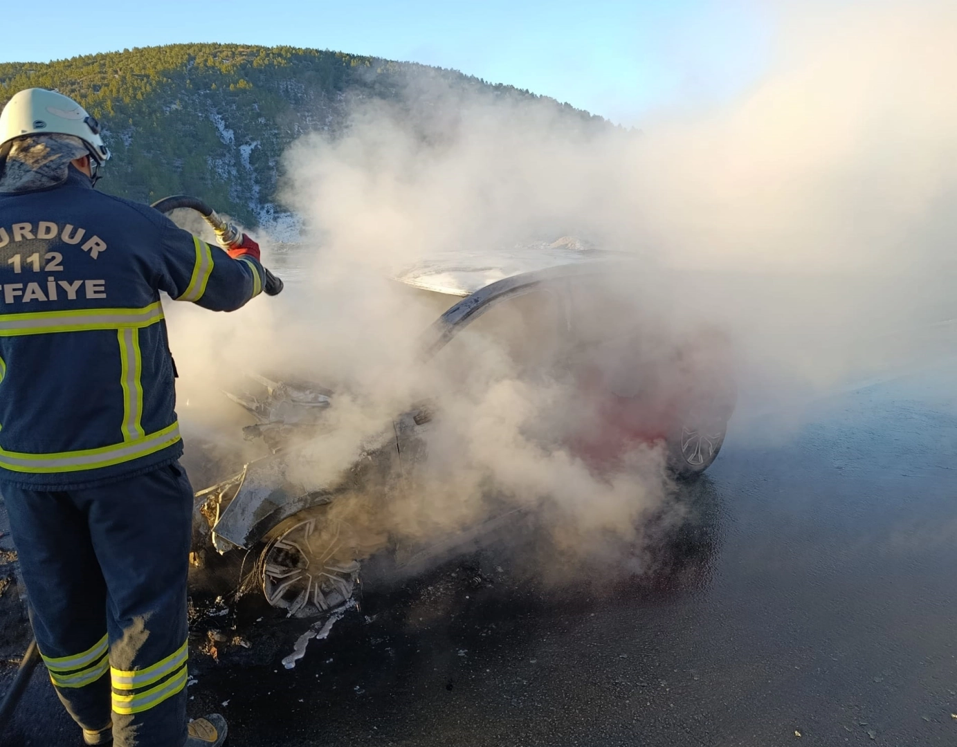 Burdur- Isparta dağ yolunda sabah saatlerinde Batuhan B. yönetimindeki 15 BB 022 plakalı otomobilin motor kısmından dumanlar yükseldi. İhbarla olay yerine sevk edilen itfaiye ekipleri tarafından söndürülen yangında otomobil kullanılamaz hale geldi. (DHA)